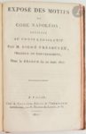 [NAPOLÉON]. Code Napoléon. Édition originale et seule officielle. Paris : imprimerie impériale, 1808. [Suivi de] : Table alphabétique et raisonnée des matières contenues dans le Code Napoléon. Paris : imprimerie impériale, 1807. [Et de] : BIGOR DE PRÉAMENEU (Félix-Julien-Jean). Exposé du Code Napoléon, présenté au corps législatif… Dans la Séance du 22 Août 1807. Paris : A. Galland, 1807. — 3 ouvrages en un volume in-8, basane racinée, filets à froid en encadrement sur les plats, dos lisse orné, tranches rouges (reliure de l'époque). Intéressant recueil réunissant le Code Napoléon et deux brochures le concernant publiées à l'époque. Ce « Code Napoléon » fut promulgué le 21 mars 1804 et publié pour la première fois cette même année sous le titre de « Code civil des français ». « Napoléon réussit là où tous les gouvernements avaient échoué avant lui : l’adoption d’un Code des lois civiles bien rédigé, facile à interpréter, triomphe du droit écrit sur les coutumes. Il fut le moteur de ce grand œuvre pensé et préparé par une cohorte des juristes de premier plan, auxquels il fournit les moyens de travailler, non sans parfois intervenir pour trancher certaines questions. L’entreprise était éminemment politique : plus qu’une conception du droit, elle contenait une vision de la société. On ne se contenta pas de compiler, mais on construisit autour de grandes options idéologiques. Lancé le 12 août 1800, le projet mit près de quatre ans à aboutir. […] Ce code fut le premier d’une longue série touchant à la fois le droit civil (droits et rapports entre les citoyens), le droit commercial (pour organiser le commerce) et le droit pénal (sanction des infractions) » (Fondation Napoléon, site napoleon.org). La « Table alphabétique et raisonnée » et l'ouvrage de Bigor de Préameneu, reliés à la suite, sont en édition originale. Accroc à la coiffe de tête, coins émoussés, petites taches sur les plats, et travaux de vers sur le second plat. Rousseurs éparses et quelques mouillures claires.