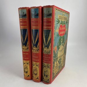VERNE (Jules). Ensemble de trois titres de Jules Verne en cartonnage « au globe doré ». - Face au Drapeau. - Clovis Dardentor. Illustrations de L. Benett. Paris : J. Hetzel et Cie, [1896]. — Grand in-8, cartonnage « au globe doré » (Engel). Première édition collective illustrée, en cartonnage « au globe doré » de type 1, c'est-à-dire « au bandeau noir », « dont c'est la seule apparition pour une nouveauté » (Jauzac, p. 280). Catalogue O pour 1896-1897 à la fin. Bel exemplaire ne comprenant que d'infimes usures et de minimes décolorations. Le dernier feuillet du catalogue présente deux déchirures sans manque. - Le Superbe Orénoque. Illustrations de George Roux. Paris : J. Hetzel et Cie, [1898]. — Grand in-8, cartonnage « au globe doré » (Engel). Première édition illustrée, revêtue du cartonnage « au globe doré » de type 3, « dont c'est la première apparition pour une nouveauté » (Jauzac, p. 284). Catalogue AJ pour 1898-1899 à la fin. Dos très légèrement passé et présentant une petite trace de mouillure au centre. Une trace noire dans la partie bleue sur le premier plat, reste d'un papier collé sur le bord du même plat. - Vingt mille lieues sous les mers illustré de 111 dessins par de Neuville et Riou. Paris : J. Hetzel et Cie, [1901]. — Grand in-8, cartonnage « au globe doré » (Engel). Exemplaire du tirage de 1901, au cartonnage « au globe doré » de type 3. Dos très légèrement passé.
