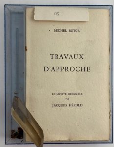 BUTOR (Michel) - HÉROLD (Jacques). Travaux d'approche. Éocène. Miocène. Pliocène. Préface-entretien avec Roger Borderie. Paris : Gallimard, 1972. — In-16, en feuilles, couverture rempliée, dans un coffret de plexiglass comprenant dans un compartiment latéral un reste de rose fanée et un morceau de cristal de roche taillé. Édition originale. Un des 70 exemplaires mis à part à l'intention de Robert Altmann, illustrés d'une eau-forte originale en couleurs signée de Jacques Hérold, dont les 4 premiers et les 4 derniers feuillets sont imprimés sur papier vélin d'Auvergne, logés dans un coffret conçu par l'illustrateur, ici comprenant un compartiment dans lequel se trouve les restes d'une rose fanée et un morceau de cristal de roche taillé, tous numérotés et signés par l'auteur et l'artiste. Petites salissures sans gravité à la couverture.