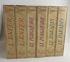 DALI (Salvador) - DANTE ALIGHIERI. La Divine comédie. Illustrations de Dali. Paris : Les Heures claires, 1959-1963. — 6 volumes in-folio, en feuilles, sous chemise et étui d’édition. Célèbre édition de la « Divine comédie » dans la traduction de Julien Brizeux, illustrée de 100 aquarelles en couleurs à pleine page de Salvador DALI (1904-1989), reproduites par les soins de Raymond Jacquet avec la collaboration de Jean Taricco. Tirage à 4765 exemplaires sur vélin pur chiffon de Rives ; celui-ci est l’un des 3900 numérotés de 866 à 4765. Usure avec manque au dos du premier étui de L'Enfer.