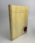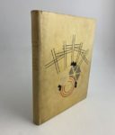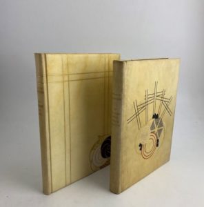 *DORGELÈS (Roland) - DUNOYER DE SEGONZAC (André). La Boule de gui. Paris : La Banderole, [1922]. - Le Cabaret de la belle femme. Paris : Émile-Paul frères, [1924]. — 2 ouvrages in-8, parchemin à la bradel, fleurs dans le style Art déco dorées, argentées et mosaïquées de différents maroquins à l'angle inférieur droit du premier plat, deux doubles filets dorés verticaux parallèles sur les deux plats et un double filet doré horizontale en continu sur les plats et le dos, dos lisse, cadre de parchemin blanc à l'intérieur, doublures de soie moirée bleu foncé bordée d'un listel de maroquin bordeaux, gardes de soie moirée bleu foncé, doubles gardes, tranches dorées sur témoins, couverture et dos conservés, étui [« La Boule de gui »] ; Parchemin ivoire, composition dans le style Art déco composé de filets noirs, dorés, blancs et rouge sur le premier plat, dos lisse, doublures et gardes de soie moirée noire, doubles gardes, tranches dorées sur témoins, couverture et dos conservés, étui [« Le Cabaret de la belle femme »] (Marot-Rodde). Ensemble de 2 des 3 titres de Dorgelès sur la grande guerre illustrés par André DUNOYER DE SEGONZAC (1884-1974). « La Boule de Gui », tirée à 600 exemplaires, est illustrée de 47 compositions de l'artiste, dont 42 dessins reproduits dans le texte et 5 pointes sèches originales hors texte, y compris le frontispice. Un des 20 exemplaires sur japon impérial enrichi d'une suite des pointes sèches sur papier de Hollande. « Le Cabaret de la belle femme », tirée à 640 exemplaires, est illustrée de 50 dessins reproduits dans le texte et 8 pointes sèches originales hors texte. Un des 40 exemplaires de tête sur japon impérial, enrichi d'une suite des pointes sèches sur Hollande. Très beaux exemplaires en reliures originales Art déco de Marot-Rodde.
