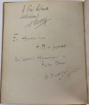 DUNOYER DE SEGONZAC (André) - DIVOIRE (Fernand). Dessins sur les danses d’Isadora Duncan… précédés de La Danseuse de Diane. Glose de Fernand Divoire. Paris : La Belle édition, [1911]. — In-8, cartonnage papier marbré et doré à la bradel, dos lisse, non rogné, couverture et dos conservés (reliure du temps). Édition originale de ce bel album rendant hommage à la célèbre danseuse et chorégraphe Isadora Duncan. Il débute par un texte de Fernand Divoire et contient 27 compositions par Dunoyer de Segonzac, dont une sur le titre, 6 dans le texte et 20 hors texte, représentant Isadora dans diverses postures de danse, seule ou accompagnée. Exemplaire sur papier PM pur chiffon, après seulement 15 sur Japon et 17 sur Hollande. EXEMPLAIRE DU PEINTRE ET HOMME DE LETTRES PAUL REBOUX (1877-1963), enrichi de ce double envoi sur la seconde de couverture : « A Paul Reboux, // Cordialement, // F. Divoire » « En hommage // A. D. de Segonzac » L'exemplaire fut par la suite acquis par l'homme de lettres et critique d'art René Blum (1878-1942), avec cet envoi autographe signé de l'artiste : « En nouvel Hommage à // René Blum // A. Dunoyer // de Segonzac » Frottements aux coiffes et sur le bord des plats. Rousseurs. Les planches quatre et cinq sont identiques.
