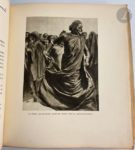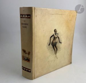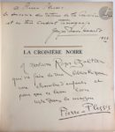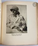 HAARDT (Georges-Marie) - AUDOUIN-DUBREUIL (Louis). La Croisière noire. Expédition Citroën Centre-Afrique. Paris : Librairie Plon, [1927]. — In-4, parchemin rigide, danseuse africaine peinte sur le premier plat, dos lisse orné d'un décor peint, non rogné, couverture et dos conservés (reliure de l'époque). Édition originale tirée à 2500 exemplaires, du second raid automobile organisé en Centre-Afrique par André Citroën et mené par Georges-Marie Haardt et Louis Audouin-Dubreuil du 28 octobre 1924 au 26 juin 1925. Il succéda à celui organisé au Sahara en 1924-1925 et précéda celui qui se déroula en Asie en 1931-1932. L'édition est illustrée d’ornements dessinés par Georges Tcherkessof, de la reproduction en frontispice du tableau de Iacovleff représentant les membres de l’expédition, d’un portrait hors texte d’André Citroën, de Georges-Marie Haardt, de Louis Audouin-Dubreuil et du commandant Bettembourg d’après les dessins de Iacovleff, de nombreuses photographies hors texte, reproduites en rotogravure d’après les clichés pris au cours du voyage, et de 4 cartes dont 3 en couleurs. Un des 2000 exemplaires sur papier d'Alfa, enrichi d'un envoi autographe signé de Georges-Marie Haardt adressé à Pierre Plessis : « A Pierre Plessis, // En témoignage du retour de la Croisière Noire // et en très cordial témoignage // Georges-Marie Haardt // 1928 » Pierre Plessis l'offrit par la suite à Madame Roger Galtier, avec cet dédicace : « A Madame Roger Galtier // qui va faire de ma bibliothèque // une chambre d'enfants et pour que ce beau livre // reste dans la maison // Pierre-Plessis. » Bel exemplaire en reliure peinte de l'époque. Salissures à la reliure. Salissures et taches à la couverture. Provenance : Pierre Plessis. - Madame Roger Galtier.
