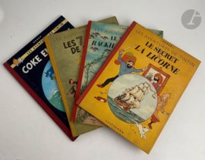 HERGÉ. Coke en stock. Paris : Castermann, [1958]. — Album in-4, cartonnage illustré de l'éditeur à dos rouge. Édition originale française. Impression Danel Loos dans le Nord, numéro 1843. Dos rouge et quatrième plat B24. Exemplaire très bien conservé avec seulement quelques frottements d'usage sur le bord des plats. On joint trois autres albums « Tintin » : - Les 7 boules de cristal. Paris : Casterman, [1949]. — Album in-4, cartonnage illustré de l'éditeur, dos jaune. Troisième tirage paru un an après l'originale, imprimée par l'imprimerie Sapho à Paris. Quatrième plat B3. Salissures au cartonnage, petits frottements aux coins. - Le Trésor de Rackham le Rouge. Paris : Casterman, [1949]. — Album in-4, cartonnage illustré de l'éditeur, dos rouge. Sixième tirage imprimé par Sapho à Paris. Quatrième plat B3. Quelques salissures au cartonnage. Plusieurs feuillets déreliés. - Le Secret de la Licorne. Paris : Casterman, [1949]. — Album in-4, cartonnage illustré de l'éditeur, dos rouge. Neuvième tirage. Quatrième plat B3. Quelques salissures au cartonnage.