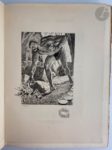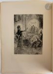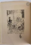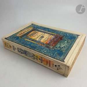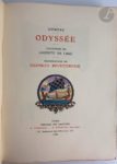 HOMÈRE - ROCHEGROSSE (Georges). Odyssée. Traduction de Leconte de Lisle. Paris : Librairie des amateurs, A. Ferroud, F. Ferroud, 1931. — In-4, broché, couverture rempliée. Édition tirée à 501 exemplaires proposant le texte de l' « Odyssée » d'Homère dans la traduction de Leconte de Lisle. Elle a été superbement illustrée par Georges ROCHEGROSSE (1859-1938) et comprend trois compositions en couleurs sur le dos et les deux plats de la couverture, vingt-cinq eaux-fortes originales hors texte gravées par Eugène Decisy, vingt-quatre bandeaux, vingt-quatre culs-de-lampe et vingt-quatre lettres ornées, gravés sur bois en couleurs par Paul Baudier, Charles Clément, Gaspérini et Pierre Gusman. Cet exemplaire, non numéroté, est semble-t-il celui unique, imprimé sur papier de Hollande. Filigrané « Van Gelder Zonen », il contient trois états des hors-texte et une suite de huit planches en couleurs sur le même papier. La justification indique que cet exemplaire unique devrait contenir tous les dessins originaux, ce qui n'est malheureusement pas le cas ici. Exemplaire très bien conservé malgré une déchirure sans manque réparée au dos.
