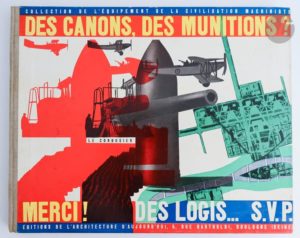 LE CORBUSIER. Des canons, des munitions ? Merci ! Des logis… S.V.P. Boulogne-sur-Seine : L'Architecture d'aujourd'hui, 1938. — In-4 oblong, cartonnage illustré de l'éditeur, à dos de toile grise. Édition originale de cette monographie composée par Le Corbusier du « Pavillon des Temps nouveaux » à l'exposition internationale « Art et Technique » qui s'est tenue à Paris en 1937. L'illustration comprend de nombreux plans et de très nombreuses photographies en noir notamment d'Albin Salaün (1876-1951). Exemplaire très bien conservé.