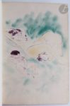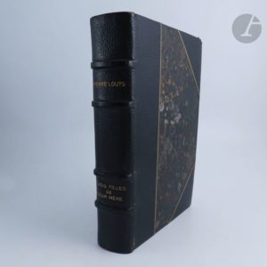 LOUŸS (Pierre) - VERTÈS (Marcel). Trois filles de leur mère. Sl. : Aux dépens d'un amateur et pour ses amis, [1926]. — In-4, demi-maroquin noir à coins, filets dorés, dos à nerfs, tête dorée, non rogné, couverture et dos conservés (reliure de l'époque). Dutel, 2516* et 2517*. Édition originale tirée à petit nombre sur papier vélin d'Arches, non mise dans le commerce. Le texte est imprimé en violet en fac-similé du manuscrit de l'auteur. Exemplaire enrichi de la suite des 17 pointes sèches originales de Marcel VERTÈS, parue en 1927 et destinée à illustrer l'ouvrage. Elle ne fut tirée qu'à 67 exemplaires sur vélin d'Arches plus quelques exemplaires hors commerce, et ne se trouve que rarement avec le texte comme c'est ici le cas. Il s'agit ici d'un exemplaire hors commerce, complet des plats de la couverture dont le second comprend la justification, et enrichi d'une épreuve en couleurs de la première gravure. Bon exemplaire, bien relié. Frottements aux coins et aux coiffes.