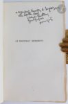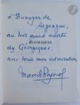PAGNOL (Marcel) - VIRGILE. Bucoliques. Traduction en vers, préface et notes de Marcel Pagnol. Paris : Bernard Grasset, [1958]. — In-12, broché, couverture rempliée. Édition originale de la traduction par Marcel Pagnol des « Bucoliques » de Virgile. Elle est illustrée sur la couverture d'une reproduction d'un bois d'Aristide Maillol. EXEMPLAIRE DU PEINTRE ANDRÉ DUNOYER DE SEGONZAC, enrichi de ce bel envoi autographe signé de Pagnol sur le faux titre : « à Dunoyer de // Segonzac, // au très grand artiste // des Géorgiques, // avec toute mon admiration // Marcel Pagnol » Quelques salissures à la couverture. Mouillure claire sur le haut du second plat. On joint, de la même provenance : - NERCIAT (Andréa de). Le Doctorat impromptu. Vignettes de Jean de Guethary. Bayonne : aux dépens d'un groupe d'amateurs, à l'enseigne de la guirlande, [1928]. — In-16, broché, couverture rempliée. Édition illustrée d'ornements en noir, de deux lettrines en bistre ainsi que de quatre compositions en couleurs dont deux à pleine page, de Gabriel Daragnès sous le pseudonyme de Jean de Guéthary. Exemplaire sur papier vélin, non numéroté, enrichi d'un envoi autographe signé de Daragnès adressé à André Dunoyer de Segonzac : « à monsieur Dunoyer de Segonzac // cette (?) chose // Jean de Guethary // quelquefois // Daragnès » Couverture légèrement décolorée. - HAVERMANS (Xavier). Ex-Libris moderne en France. Paris : Xavier Havermans, [1925]. — In-8, broché. Recueil d'ex-libris tiré à 215 exemplaires. Un des 200 sur vélin d'Arches, enrichi de cet envoi autographe signé de l'éditeur : « A André Dunoyer de Segonzac // avec mes très bonnes amitiés. // Xavier // Havermans // Le 15 Avril 1925 » Couverture salie et piquée. Très bon état intérieur.