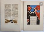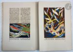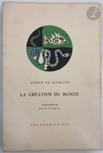 RICHAUD (André de) - LURÇAT (Jean). La Création du monde précédé de Richaud du Comtat par Pierre Seghers. Paris : Les Exemplaires, [1949]. — In-folio, en feuilles, couverture rempliée, chemise et étui de l'éditeur. Édition rare, tirée à seulement 99 exemplaires hors commerce sur vélin d'Arches, illustrée de plus de cinquante gouaches de Jean LURÇAT, portées sur pierres lithographiques et tirées par Mourlot frères, dont une sur la couverture, une sur le titre et les autres dans le texte. Exemplaire spécialement imprimé pour Marcel Hazebrouck, bien conservé. Quelques défauts sans gravité à l'étui.