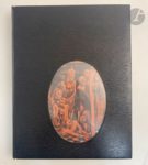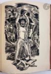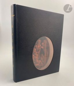 SHAKESPEARE (William) - DECARIS (Albert). Macbeth. Traduction de François-Victor Hugo, revue par Daniel Sargent et Léon Cathlin. Paris : Éditions du fuseau chargé de laine, [1931]. — In-4, maroquin noir à long grain, fenêtre ovale sur le premier plat, dos lisse, doublures et gardes de daim rose chair, fenêtre ovale à la première garde, la même que sur le premier plat, laissant apparaître une partie de la couverture, tête dorée, non rogné, couverture et dos conservés, étui (Montecot). Belle édition illustrée de 112 gravures originales sur cuivre d'Albert DECARIS. Tirage à 365 exemplaires, celui-ci étant l'un des 285 sur vergé Montval. Très bel exemplaire en reliure de Montecot, très bien conservé.