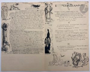 [SURRÉALISME]. Cycle systématique de conférences sur les plus récentes positions du surréalisme. [Paris], juin 1935. — Double feuillet in-8. Programme, avec carte d'inscription détachable, se rapportant à un cycle de 4 conférences surréalistes qui n'eurent jamais lieu. Il comprend une présentation d'André Breton sur quatre pages, en reproduction de son écriture, entourée de dessins de Salvador Dali, Alberto Giacometti, Max Ernst, Man Ray, Oscar Dominguez, Valentine Hugo, Jean Arp, Marcel Duchamp, Marcel Jean et Yves Tanguy. Exemplaire très bien conservé.