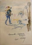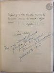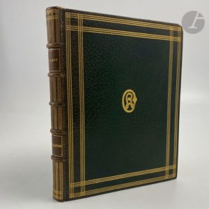 VALÉRY (Paul). Eupalinos. Paris : NRF, 1924. — In-8, maroquin vert foncé, filets dorés en encadrement et serpent doré formant la lettre R au centre sur les plats, dos à nerfs orné, filets dorés en encadrement à l'intérieur, tête dorée, non rogné, couverture et dos conservés (Gruel). Nouvelle édition publiée un an après l'originale. Exemplaire non numéroté, imprimée sur papier vergé pur fil des papeteries Lafuma de Voiron au filigrane de la NRF, sous couverture spéciale. EXEMPLAIRE DE L'ÉCRIVAIN ET HOMME POLITIQUE GASTON RIOU (1883-1958), revêtu d'une très belle reliure originale de Gruel, ornée d'un serpent dessinant le chiffre R de Riou au centre des plats. Il a été enrichi d'UN DESSIN ORIGINAL EN COULEURS DE PAUL VALÉRY, représentant visiblement Robinson Crusoé, signé et daté de Bénerville le 1er septembre 1922. Il comporte également un feuillet sur lequel figure une copie autographe signée par Valéry d'une phrase d' « Eupalinos », accompagnée de cet ex-dono de la main de la philanthrope américain et amie de Gaston Riou, Florence Blumenthal (1873-1930) : « For my deared friend // Gaston Riou // from his devoted // Florence Blumenthal // June 25the 1925 ». Dos passé, coins supérieurs émoussés.