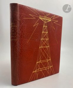 VERHAEREN (Émile). Les Villes tentaculaires. Paris : Le Jacquemart, [1950]. — In-4, maroquin fauve, premier plat orné d’une grande antenne radiophonique dorée, second plat orné d’éclairs dorés au centre, dos lisse, intérieur comprenant un encadrement de maroquin fauve orné d’un filet doré, doublures et gardes de papier bois vert, tête dorée, non rogné, couverture et dos conservés, étui (Florence Weingarten). Édition tirée à 125 exemplaires, illustrée de gravures sur bois en noir et en couleurs dans le texte et à pleine page, de Paul BAUDIER. Un des 75 exemplaires sur papier vélin de Rives réimposés sur format in-4 carré. Belle reliure réalisée par Florence Weingarten. Dos passé. Le premier cahier est légèrement dérelié. Deux feuillets blancs ont été ajoutés, le premier après le faux titre et le second après le titre.