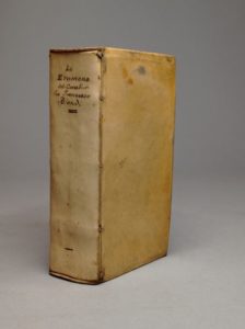 BIONDI (Giovan Francesco). La Eromena. Rome, Corvo, 1647. - La Donzella. S.d. Ensemble 2 ouvrages en un volume petit in-12, vélin à recouvrement, titre à l'encre postérieur au dos (Reliure de l'époque). Fameux romans héroïco-galants du XVIIE siècle baroque, composés par Giovan Francesco Biondi (1572-1644), diplomate au service du roi Jacques Ier Stuart, et parus pour la première fois en 1624 et 1627. Ex-libris gravé indéterminé. Trou supprimant 2 ou 3 lettres au feuillet E1, quelques légères rousseurs. Manque le titre de La Donzella.