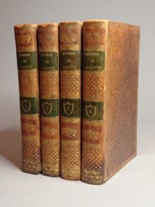 CAZOTTE (Jacques). Œuvres badines et morales, historiques et philosophiques. Paris, Jean-François Bastien, 1817. 4 volumes in-8, basane racinée, roulette dorée, dos lisse orné, pièces vertes, tranches marbrées (Reliure de l'époque). Première édition complète, ornée d'un portrait, 8 figures et une planche de musique. Petits accidents à la reliure.