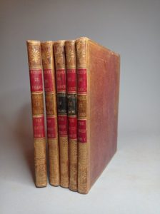 DAVID. Histoire de France sous l'Empire de Napoléon le grand, représentée en figures accompagnées d'un précis historique. Paris, Chez l'Auteur, David, 1809-1812. 5 volumes in-4, veau granité, roulette dorée, dos lisse orné, pièces rouges, roulette intérieure, tranches dorées (Reliure de l'époque). 60 planches gravées par David d'après Monnet. Quelques rousseurs. Dos frotté, petit accroc à deux coiffes.