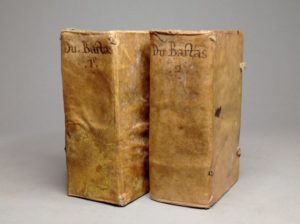 DU BARTAS (Guillaume de Saluste). Première [- Seconde] Sepmaine ou Création du monde. Rouen, De l'Imprimerie de Raphaël du Petit Val, 1616. 2 volumes in-12, vélin, traces d'attaches, dos lisse portant le nom de l'auteur et les tomaisons à l'encre (Reliure de l'époque). Rare édition rouennaise des œuvres de Du Bartas, soigneusement imprimée par Raphaël du Petit Val. Elle est majoritairement occupée par la Sepmaine, célèbre poème encyclopédique qui retrace avec une verve extraordinaire le récit de la création du monde, sa suite (la Seconde Sepmaine), ainsi que diverses poésies de l'auteur : la Judith, l'Uranie, le Triomphe de la foy, l'Hymne de la paix, les Neuf muses, la Lépanthe, le Cantique de la victoire d'Ivry, etc. La Sepmaine est ornée de 7 petites vignettes sur bois. Infimes piqûres de vers touchant la marge de quelques cahiers. Tome I, les derniers cahiers sont légèrement rongés en pied, sans gravité. Petit défaut de papier supprimant quelques lettres à la manchette au verso du f. Xx5 au tome II. Mouilure sur le bord d'une dizaine de cahiers. Vélin un peu taché. Sinon PLAISANT EXEMPLAIRE EN VELIN ANCIEN.