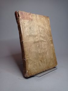 IMPRESSION EN GREC. - DIOGÈNE LAERCE. [En grec] : De vitis dogmatis et apophtegamatis eorum. Rome, Aloysius Zanetti, 1594. In-folio, vélin souple (Reliure de l'époque). Édition bilingue connue sous le nom d'Aldobrandina, imprimée sur deux colonnes, en grec et en latin. La traduction et les notes sont de Tommaso Aldobrandini : ce dernier mourut en 1572 et ce fut donc son oncle, le cardinal Pietro Aldobrandi, qui publia le fruit de son travail. L'ouvrage de Diogène Laerce, les Vies, doctrines et sentences des philosophes illustres, fut une source importante pour la connaissance des philosophes antiques à la Renaissance. Des rousseurs ; mouillure marginale touchant les premiers feuillets, plus importante aux cinq derniers cahiers. Le volume est déboîté de sa reliure qui est défraîchie et usagée, le dernier feuillet détaché et volant.