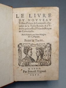 MAUGIN (Jean). Le Livre du Nouveau Tristan, Prince de Leonnois, chevalier de la Table Ronde, & d'Yseulte, princesse d'Yrlande, Royne de Cornoüaille. Lyon, Benoît Rigaud, 1577. Fort volume in-16, veau fauve, dos orné, tranches rouges (Reliure du XVIIIe siècle). RARE EDITION LYONNAISE DE CE ROMAN DE CHEVALERIE, lequel parut pour la première fois à Paris en 1554. (Baudrier, t. III, p.335.) Charmante vignette gravée sur bois au titre. Ex-libris manuscrit du XVIIe siècle répété. Manque le dernier feuillet Ii8 (blanc ou marque ?). Quelques légères rousseurs, mouillure sur le bord de plusieurs cahiers. Frottements à la reliure, fissure à la charnière inférieure qui reste néanmoins solide.