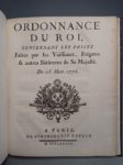 MARINE. - Recueil de 8 pièces concernant la course en mer, notamment pendant l'intervention française dans la Guerre d'Indépendance américaine. In-4, bradel cartonnage moderne. Ordonnance du Roi, concernant les prises faites par les Vaisseaux, Frégates & autres Bâtimens de Sa Majesté. Du 28 mars 1778. Paris, Imprimerrie royale, 1778. 15 pages. - Lettre du Roi à M. l'amiral, pour faire délivrer des Commissions en Course. Du 10 juillet 1778. [Paris, Imprimerie royale, 1778]. 3 pages. - Déclaration du Roi, concernant la Course sur les Ennemis de l'État. Registrée en Parlement le 14 juillet 1778. Paris, Imprimerie royale, 1778. 21 pages. - Instruction que le Roi veut être observée, par les Officiers de ses Vaisseaux, pour les Prises qu'ils feront sur ses Ennemis. Du 27 septembre 1778. [Paris, Imprimerie royale, 1778]. 6 pages. - Ordonnance du Roi, concernant les formalités qui doivent être observées par les Officiers de ses Vaisseaux, pour les Prises qu'ils feront sur les Ennemis de Sa Majesté. Du 27 septembre 1778. [Paris, Imprimerie royale, 1778]. 3 pages. - Règlement concernant les prises que des Corsaires François conduiront dans les Ports des États-Unis de l'Amérique ; & celles que les Corsaires Américains amèneront dans les Ports de France. Du 27 septembre 1778. Paris, Imprimerie royale, 1778. 8 pages. - Édit du Roi, portant règlement sur les fonctions judiciaires & de police, qu'exercent les Consuls de France en pays étrangers. [Paris, Imprimerie royale, 1778]. 23 pages. - Ordonnance du Roi, concernant les Reprises faites par les Vaisseaux, Frégates & autres Bâtimens de Sa Majesté. Du 15 juin 1779. [Paris, Imprimerie royale, 1779]. 4 pages. Papier de la seconde pièce roussi. Trace de ver dans le fond des cahiers et dans certaines marges.