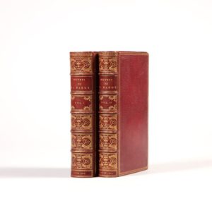 MAROT (Clément). Œuvres. Lyon, Scheuring, 1869. 2 volumes in-8, maroquin rouge, triple filet doré, dos orné, dentelle intérieure, tranches dorées (Hardy). TRES JOLIE EDITION, CHEF-D'ŒUVRE DE L'IMPRIMEUR LYONNAIS LOUIS PERRIN, entièrement réglée à la presse d'un filet rouge et ornée d'un portrait de l'auteur en frontispice. Un des 150 exemplaires sur papier teinté. Plaisant exemplaire dans une reliure signée de Hardy, le décor du dos, à motifs de feuillages et d'entrelacs, inspiré de ceux du XVIe siècle. Minimes frottements sur les nerfs.