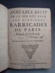 MAZARINADES. Ensemble environ 50 pièces en un volume in-4, veau granité, dos orné (Reliure du XVIIe siècle). Pièces datant de 1649-1651 parmi lesquelles nous citerons : Agréable récit de ce qui s'est passé aux dernières barricades de Paris, Le Théologien d'estat fidellement traduit en vers burlesques, Le Passe-temps de Ville-Juif en vers burlesques, Le Combat et le cartel de deffit de l'amour à la paix, Le Combat furieux de deux Italiens, Le Siège d'Aubervilliers en vers burlesques, Le Coup de foudre ou l'écho du bois de Vincenne, Le Paranimphe mazarinique, etc. Des rousseurs, importants travaux de vers aux deux premières pièces. Reliure frottée et tachée, manque en queue. Pièce de tomaison grattée au dos.