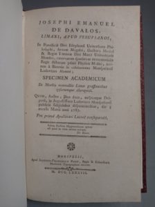PÉROU. - DAVALOS (José-Manuem de). De Morbis nonnullis Limae grassantibus ipsorumque therapeia. Montpellier, Picot, 1787. In-8, bradel cartonnage moderne. Édition originale de la thèse de ce médecin péruvien, lequel, ayant quitté son pays natal, se rendit à Paris puis à Montpellier où il séjourna quelques années de 1784 à 1788 et y étudia la botanique, la chimie et l'anatomie. Dédiée à la glorieuse ville de Lima, sa dissertation traite des quelques maladies qui règnent dans cette cité et de leurs divers traitements.
