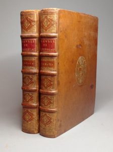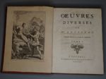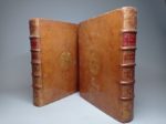ROUSSEAU (Jean-Jacques). Œuvres diverses. Londres, De l'Imprimerie de Jacob Tonson & Jean Watts, 1723. 2 volumes in-4, veau fauve, armoiries au centre, dos orné, pièce de titre rouge, tranches rouges (Reliure de l'époque). Édition ornée d'un frontispice gravé sur cuivre par L. Chéron. EXEMPLAIRE AUX ARMES, qu'une note indique comme étant celles de Guy-Michel de Durfort, duc de Lorges et de Randon (1704-1773), maréchal de France. Manque le feuillet R2 correspondant aux pp. 131-132. Minimes frottements à la reliure, quelques légères rousseurs.