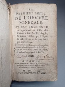 GLAUBER (Johann-Rudolph). Recueil de 6 ouvrages ou parties en un volume in-8, vélin souple de l'époque. RECUEIL DE 4 RARES TRAITES D'ALCHIMIE DE GLAUBER (1604-1670), chimiste et alchimiste allemand, constitué de la manière suivante : - La Première partie de l'œuvre minérale, où est enseignée la Séparation de l'Or des Pierres à feu... (Caillet, n°4584.). - La Seconde partie de l'œuvre minérale. De la naissance & origine de tous les Métaux & Minéraux. (Caillet, n°4584.) - La Troisième partie de l'oeuvre minérale. Commentaire sur le livre de Paracelse. (Caillet, n°4584.) - La Teinture de l'or ou le Véritable or potable. (Caillet, n°4588.) - Traitté de la médecine universelle, ou le vrai or potable. (Caillet, n°4589.) - La Consolation des navigants. Dans laquelle est enseigné à ceux qui voyagent sur mer un moyen de se garantir de la faim & de la soif, voire mesme des maladies qui leur pourroient survenir durant un long voyage. (Caillet, n°4569.) Ces 4 ouvrages, le premier divisé en trois parties, sont tous en pagination séparée et possèdent une page de titre particulière : ils sont tous dans la première traduction française, par Du Teil, à l'adresse de Paris, Thomas Jolly, 1659. Mouillure atteignant les deux premières parties, lacération dans le blanc de la première page de titre qui est salie et piquée, petites traces de vers dans le fond de quelques cahiers. Manque la première garde.
