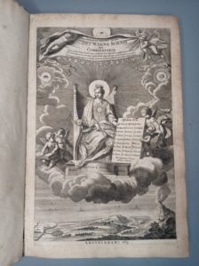KIRCHER (Athanase). Ars magna sciendi, in XII libros digesta. Amsterdam, Jansson à Waesberge, 1669. 2 tomes en un volume in-folio, vélin à recouvrement, dos lisse, titre à l'encre en tête, tranches bleues (Reliure de l'époque). Caillet, II, n°5771. - Dorbon, n°2380. - Merrill, n°22. Édition originale. Ouvrage dans lequel Kircher, célèbre savant jésuite, expose un très curieux système scientifique, basé sur l'art combinatoire et la logique symbolique, permettant d'accéder à l'ensemble des connaissances universelles. Ornée de 2 beaux frontispices, d'une planche de l'arbre philosophique, et de 5 tableaux dépliants dont deux réunis pour n'en former qu'un (pp. 406-407) ; les diagrammes des pp. 13 et 173 sont bien pourvues de leurs volvelles qui sont à l'origine tirées à part pour être découpées. Bel exemplaire. Manque le portrait du dédicataire, l'empereur Léopold Ier. Rousseurs uniformes.