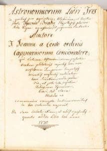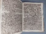 MANUSCRIT. - Astronomicorum libri tres in quibus pro agricoltura , medicina, et nautica juxta Tyconis Brahe... Auctore F. Joanne a Cento ordinis Capuccinorum... De vera Cabala etiam et aliis opusculis quarto addito libro hoc anno 1770. Manuscrit petit in-4 (environ 210 x 150 mm), 480 pages et environ 74 feuillets, demi-vélin avec petits coins, dos lisse (Reliure du début du XIXe siècle). IMPORTANT MANUSCRIT D'ASTRONOMIE ET D'ASTROLOGIE COMPOSE PAR LE FRERE CAPUCIN GIOVANNI DE CENTO, D'UNE ECRITURE TRES SERREE DU XVIIIE SIECLE ET ORNE DE FIGURES ASTRONOMIQUES. L'auteur étudie toutes les branches de l'astronomie dans leurs rapports avec les sciences qui en découlent : origine et de histoire de l'astronomie, les systèmes planétaires de Ptolémée, Tycho Brahé et Copernic, construction et emploi des horloges et cadrans solaires, les astres, les étoiles, le zodiaque, les phénomènes célestes, etc. Le troisième livre est consacré à l'astrologie. On y trouve aussi un traité intitulé De genethliacum facultate consacré au don des horoscopes par les astres et les planètes, d'un grand intérêt pour ceux qui s'intéressent aux sciences occultes. Le manuscrit contient aussi une grande quantité de tableaux, thèmes et figures. Incomplet des pp. 481 à 581 selon la table, qui devait contenir la partie relative à la cabale (cahiers arrachés à partir de la p. 480 et numérotation des pages suivantes grattée pour dissimuler cette lacune). Pièce de titre postérieure. Petits frottements à la reliure.