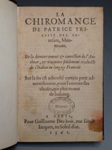 TRICASSE (Patrice). La Chiromance. Paris, Pour Guillaume Des-Bois, 1561. In-8, chagrin noir, encadrement de filets à froid et dorés, dos orné, triple filet intérieur doré, tranches dorées (Reliure du XIXe siècle). Caillet, n°10827. Traduction française de ce fameux traité de chiromancie, l'un des plus rares et des plus complets sur le sujet, ornée de nombreuses figures de mains gravées sur bois dans le texte. L'ouvrage, œuvre du dominicain et mathématicien italien Patrizzio Tricasso da Ceresari (1466-1532), fut imprimé pour la première fois à Venise en 1524 et fit l'objet de la censure pontificale. Cachet humide sur le titre : Bibliothèque de Me Denis à Hyères. Exemplaire court de marges, le couteau du relieur ayant parfois supprimé des signatures de cahiers. Quelques taches et mouillures. Petits manques aux coiffes.