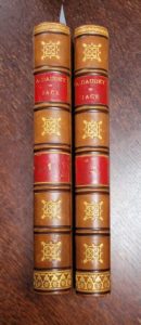 DAUDET (Alphonse). Jack. Mœurs contemporaines. Édition précédée de l'histoire de ce livre et ornée de deux dessins par Charles Delort. Paris, Dentu, Charpentier, 1882. 2 volumes in-8, demi-veau fauve, dos orné, pièces de titre et de tomaison rouges, tête peigne (Reliure de l'époque). Note autographe de l'auteur au verso du frontispice du tome I : J'ai devant moi sur la table, où j'écris ceci, une photographie de Nadar, le portrait d'un garçon de dix-huit à vingt ans, douce figure maladive aux traits indécis, aux yeux d'enfant rieurs et clairs, dont la vivacité contraste avec l'affaissement d'une bouche molle, fanée, comme détendue, une bouche de pauvre homme qui a beaucoup pâti. C'est Raoul D*** le Jack de mon livre. De la bibliothèque Paul Muret, avec ex-libris sur le faux-titre. Quelques piqûres sur les tranches, sinon AGREABLE EXEMPLAIRE, BIEN RELIE.