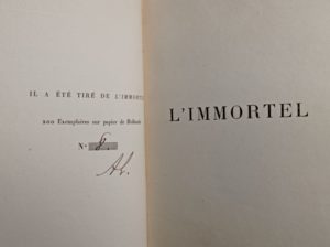 DAUDET (Alphonse). L'Immortel. Mœurs parisiennes. Paris, Alphonse Lemerre, 1888. In-12, demi-maroquin vert avec coins, filet, dos orné de jeux de filets, tête dorée, non rogné, couverture et dos (René Aussourd). Edition originale. Un des 200 exemplaires sur hollande. Dos passé.