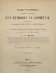 - Aperçu historique sur l’origine et le développement des méthodes en géométrie, particulièrement de celles qui se rapportent à la géométrie moderne... Seconde édition. Paris, Gauthier-Villars, 1875 ; in-4, demi-basane beige de l’époque.