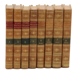 - Bulletin des sciences mathématiques, astronomiques, physiques et chimiques. Paris, Treuttel & Würtz, Dufour et d’Ocagne, Rey et Gravier et autres... 1824-1826 ; 6 tomes en 3 forts volumes in-8, demi-basane blonde à coins, dos lisses ornés, pièces de titre rouges, tranches jaunes (Rel. de l’époque). 2 ff., 384 pp., 2 ff., 19 pp., 360 pp. - 2 ff., 22 pp., 384 pp., 2 ff., 368 pp. - 2 ff., 384 pp., 2 ff., 18 pp., 368 pp. Tomes 1 à 6 formant la tête de série de la première section de la revue, à la fin de l’entreprise cette section comptait 16 tomes.