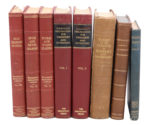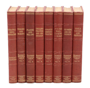 - JONES (Franklin D.) Machinery’s Mechanical Library. New York, The Industrial Press, 1914-1915 ; 10 vol. in-8, cartonnage rouge d’éditeur, têtes dorées. Turning and boring - Planing and milling - OSBERG (E.) & JONES Drilling practice and jig design - HAMILTON (D. T.) & JONES. Advanced grinding practice - Modern toolmaking methods - Diemaking and die design - DOWD (A. A.) Tools, chucks and fixtures - OSBERG. Heat-treatment of steel - OSBERG. Spur and bevel gearing - Spiral and worm gearing - Shrapnel shell manufacture.