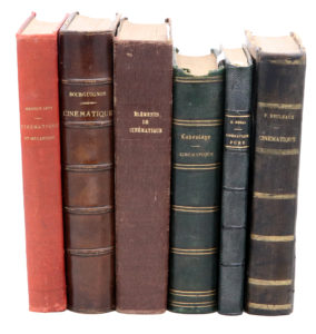 - REULEAUX (F.). Cinématique, principes fondamentaux d’une théorie générale des machines. Trad. de l’allemand par A. Debize. Paris, Savy, 1877 ; in-8, demi-bas. noire de l’époque.