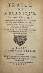 LA HIRE (Philippe de) — Traité de mécanique, ou l’on explique tout ce qui est nécessaire dans la pratique des Arts, et les propriétés des corps pesants lesquelles ont un plus grand usage dans la Physique.