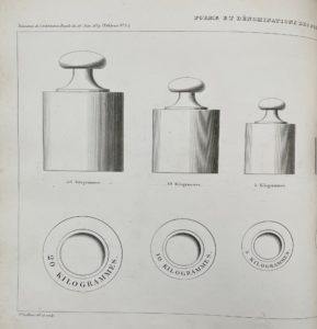 - ATLAS des Poids et Mesures dressé en exécution de l’ordonnance royale du 16 juin 1839. P., Ministère de l’Agriculture et du Commerce, 1839 ; in-4, demi-chagrin moderne. titre gravé, table imprimée et 14 doubles planches.