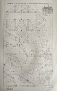 4 livraisons de cette remarquable publication montés sur onglets et rassemblés en 1 volume. Dessins de charpentes de toiture, escaliers, éléments d’architecture, cintres de ponts, etc.