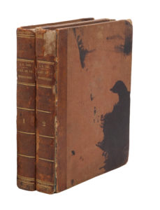 Taches éparses sur les vol. de texte, reliures usagées, charnières fendues, plats tachés, manque de cuir au dos du 2e tome.