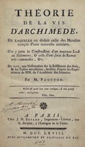 PAUCTON (Alexis-Jean-Pierre) — Théorie de la vis d’Archimède, de laquelle on déduit celle des moulins conçus de nouvelle manière. On y joint la construction d’un nouveau lock ou sillomètre, et celle d’une sorte de rames très commodes...