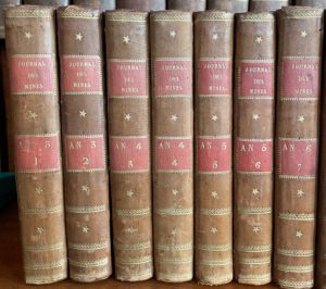 Paris, Du Pont, Impr. de la République, Bossange et Masson, et autres, 1794-1815. 33 volumes in-8, demi-basane fauve, dos lisses ornés de filets, guirlandes et étoiles dorées, tranches jaunes (Reliure de l'époque).Du numéro 1 (Vendémiaire an III) au n° 37 (premier semestre 1815). Manque les n° 14, 24, 30, 31. Rare ensemble en reliure uniforme de la première mouture parue sous la République et l’Empire qui deviendra les Annales des Mines à partir de 1816.