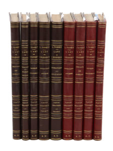 - Partie didactique, projets, série A, B, C, D, travaux d’édilité, 5 vol. in-8, demi-chagrin brun, dos à nerfs orné de fil. dor, titres dorés, roulette dor., chiffre doré A. D. au bas des dos. Exemplaire soigneusement établi dans de belles reliures de l’époque. Coins de certains titres (ex-libris) découpés. 2 atlas in-folio en feuilles chacun sous couverture illustrée, les deux rassemblées dans une chemise en cartonnage illustré de l’éditeur titré “Projet d’élévation d’eau par moteur hydraulique et manche à vapeur de secours” daté P., Bernard, 1888. 4 autres atlas in-folio en ff. sous couv. imprimée datés 1883 ou sans date portant le titre de la section : Résistance des matériaux, Cinématique, Physique industrielle et Hydraulique appliquée.