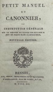 réunies en 1 vol. in-8, cart. toile marbrée (Toile de l'époque).- Petit manuel du canonnier ou instruction générale sur le service de toutes les bouches à feu en usage dans l’artillerie. Nouvelle édition. Rennes, J. Frout, 1812 ; in-12. 102 pp., 1 tableau dépl. et 1 grande planche portant 8 figures de canons et 6 fig. de nœuds. Une des très nombreuses éditions de ce manuel originellement paru en 1786. - Barbier III, 46.