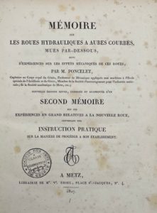 PONCELET (J.-V.) — Mémoire sur les roues hydrauliques à aubes courbes mues par-dessous, suivi d’expériences sur les effets mécaniques de ces roues. Nlle édition augmentée d’un second mémoire sur des expériences en grand relatives à la nouvelle roue...