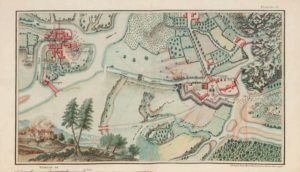 FOSSÉ (Charles-Louis-François de). Idées d'un militaire dans la disposition des troupes confiées aux jeunes officiers dans la défense et l'attaque des petits postes. Paris, De l'Imprimerie de France, Ambroise Firmin Didot, Alexandre Jombert jeune, 1783. 2 parties en un volume in-4, cartonnage papier bleu, non rogné (Reliure de l'époque). Édition originale de ce traité de stratégie militaire, dédiée au duc du Châtelet, lieutenant-général des armées du Roi. Remarquable illustration gravée en couleurs « en manière de pastel » par Louis-Marin Bonnet (1736-1793), artiste qui s'est ici défini - à tort - comme le "premier graveur dans ce genre" : une vignette aux armes du dédicataire et 11 planches de plans gravées d'après les dessins de l'auteur. Un chapitre de l'ouvrage concerne l'emploi des couleurs pour les lavis des plans. Exemplaire en cartonnage d'attente de l'époque. Petite galerie de ver comblée dans la marge supérieure de six feuillets. Quelques légères piqûres.