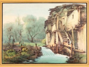 ALBUM de 31 lithographies des années 1820-1830 coloriées. Petit in-folio, demi-cuir de Russie rouge, plats de papier maroquiné vermillon, titre doré sur le premier plat, dos lisse portant le titre en long (Reliure de l'époque). 31 jolies lithographies finement coloriées à l'époque : 2 marines de Théodore Gudin, une scène de genre par Horace Vernet, 5 scènes militaires dont deux de Nicolas Charlet, et 23 paysages et scènes champêtres, la plupart animés de personnages. Épreuves découpées et montées sur des feuillets de papier chamois. Le titre mentionne 37 planches, donc 6 lithographies ont été soustraites du volume par un ancien propriétaire. Petits frottements au dos, légère restauration à un mors.