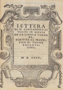 CITOLINI (Alessandro). Lettera in difesa de la lingua volgare, scritta al Magnifico M. Cosmo …